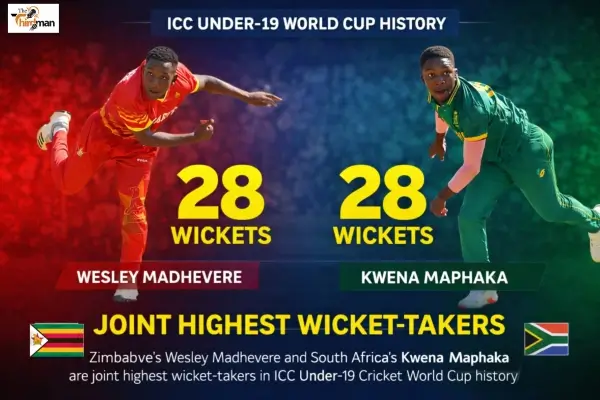 Zimbabwe’s Wesley Madhevere and South Africa’s fast bowler Kwena Maphaka share the record for the most wickets in ICC Under-19 Cricket World Cup history.